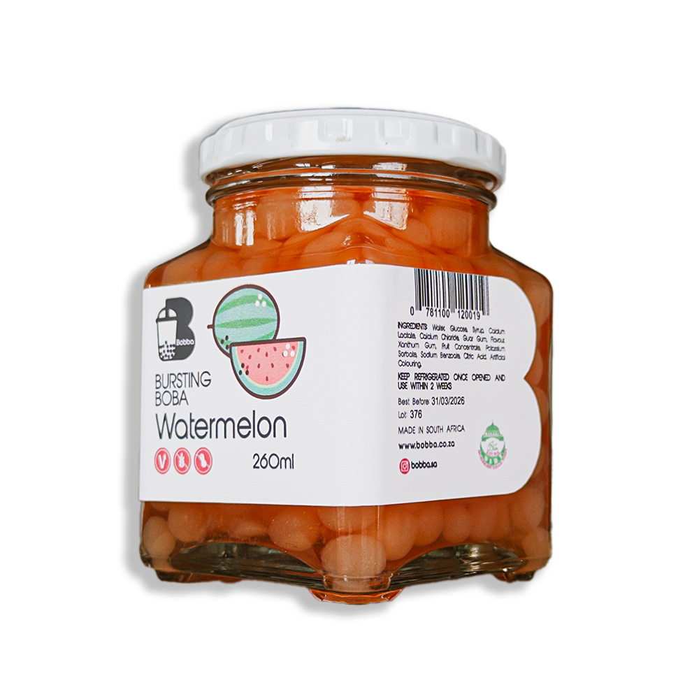 Bring the taste of summer to your drinks and desserts with our Watermelon Bursting Boba. These small, juice-filled pearls burst in your mouth, releasing a sweet and refreshing watermelon flavour with every bite. Perfect for adding a juicy twist to your bubble tea, iced teas, and desserts, our Watermelon Bursting Boba is a delightful way to elevate your favourite beverages and treats.