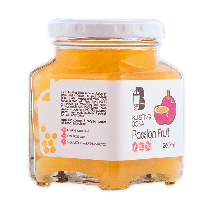 - Passion Fruit Bursting Boba: Experience the tangy and exotic taste of passion fruit that brings a vibrant twist to your beverages and treats.